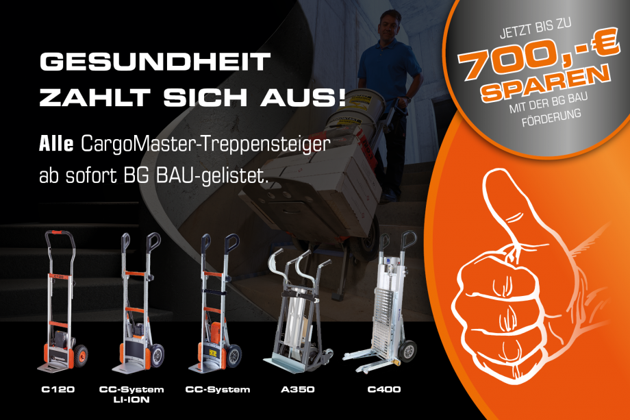 Ab sofort ist das gesamte CargoMaster-Treppensteiger-Sortiment offiziell bei der BG BAU gelistet – und damit förderfähig! Bis zu 700 € Zuschuss sind über die Arbeitsschutzprämie möglich. Unsere elektrischen Treppensteiger erfüllen alle Anforderungen an ergonomischen und sicheren Lastentransport – i…