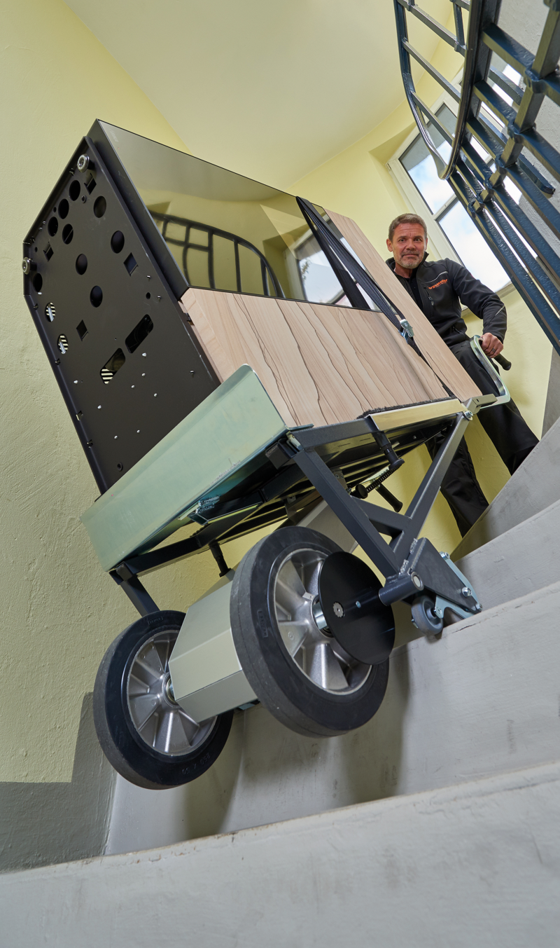 In many businesses, it is part of everyday life: heavy ovens, heating appliances, or bulky components have to be transported up and down stairs — often through narrow stairwells and several times a day. This puts strain on backs and joints and ties up staff who are needed elsewhere.