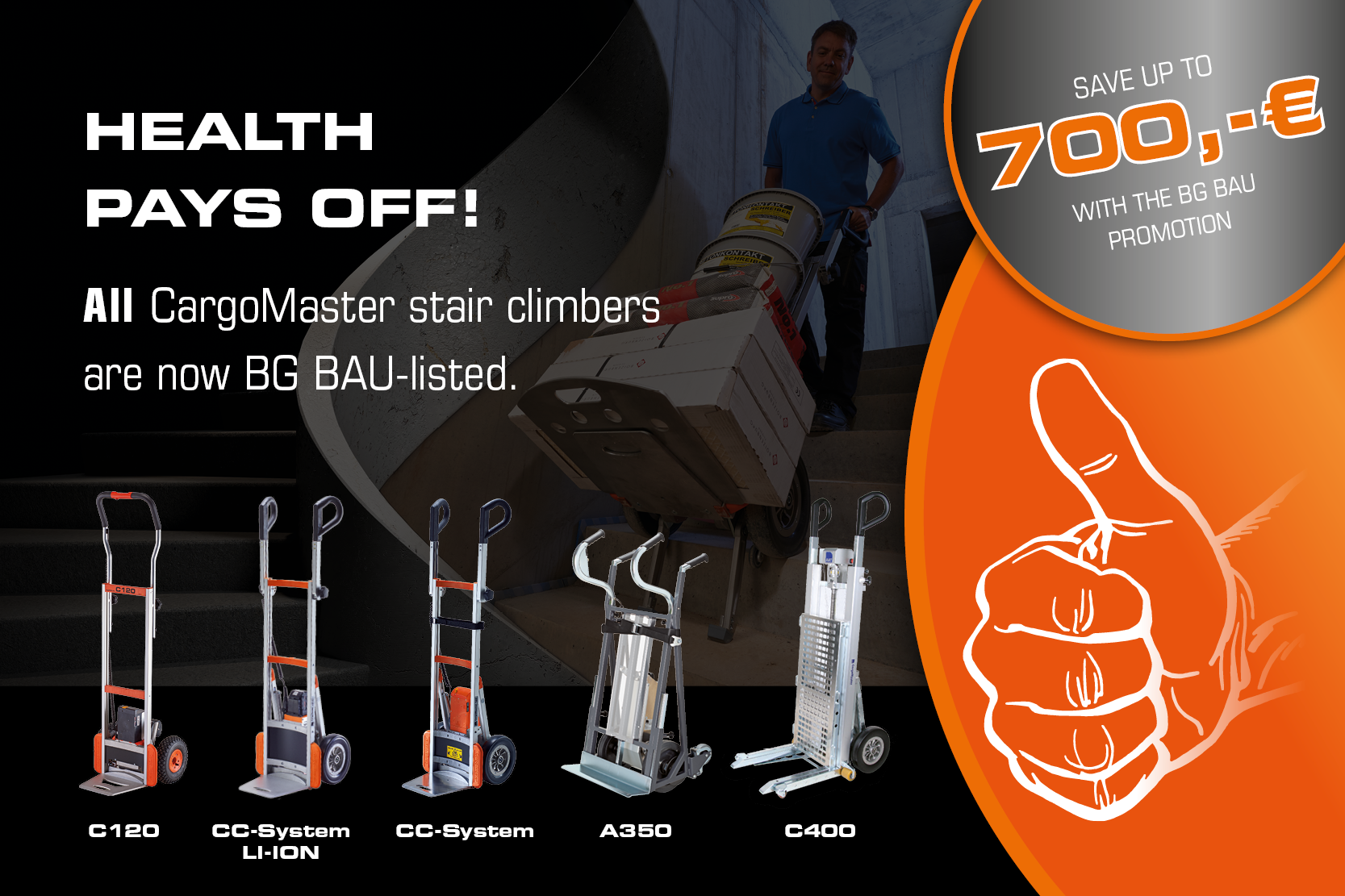 The entire CargoMaster stair climber range is now officially listed with BG BAU - and therefore eligible for subsidies! Up to 700 € subsidy is possible via the occupational safety premium. Our electric stair climbers meet all requirements for ergonomic and safe load transport - ideal for constructi…