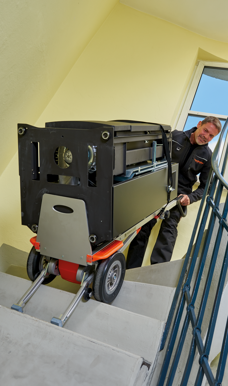 In molte aziende è all'ordine del giorno: forni pesanti, apparecchi di riscaldamento o componenti ingombranti devono essere trasportati su e giù per le scale, spesso attraverso scale strette e più volte al giorno. Ciò mette a dura prova la schiena e le articolazioni e impegna il personale che sarebbe necessario altrove.
