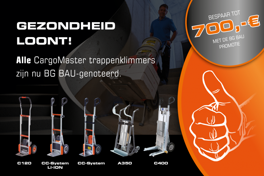 The entire CargoMaster stair climber range is now officially listed with BG BAU - and therefore eligible for subsidies! Up to 700 € subsidy is possible via the occupational safety premium. Our electric stair climbers meet all requirements for ergonomic and safe load transport - ideal for constructi…